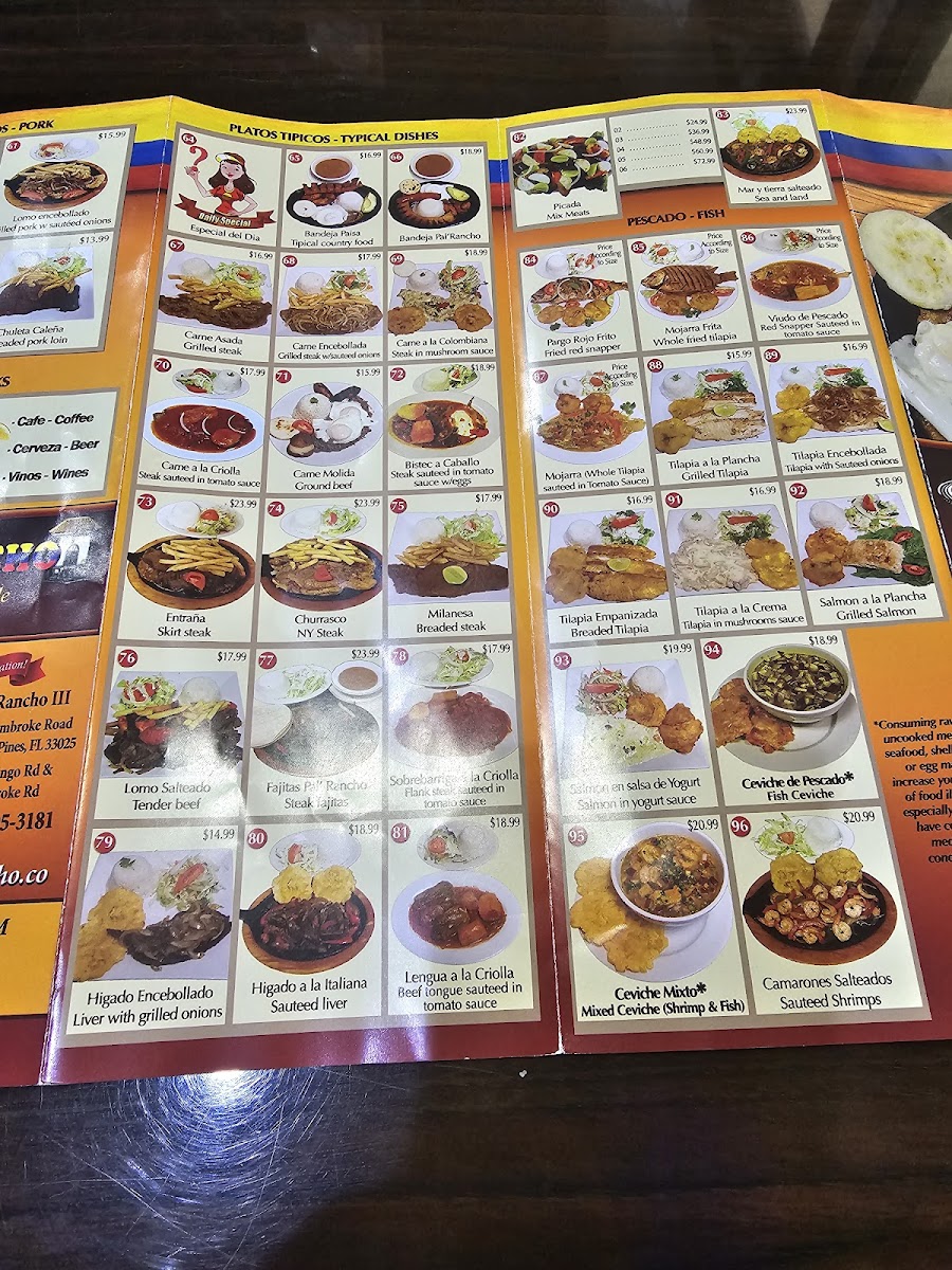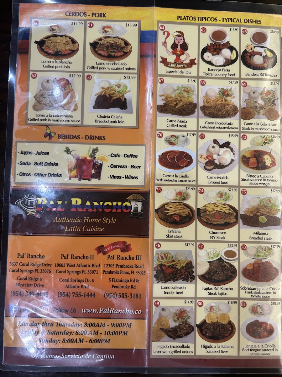 Bandeja paisa Pal' Rancho se sirve con arroz blanco, frijoles rojos, bistec redondo o carne molida a la parrilla, chicharrón, chorizo frito, plátanos maduros, huevo frito, arepa pequeña y una rebanada de aguacate. / Pal’ Rancho paisa tray is served with white rice, red beans, grilled top round steak or ground beef, pork rind, fried sausage, sweet plantains, fried egg, small arepa and one slice of avocado.