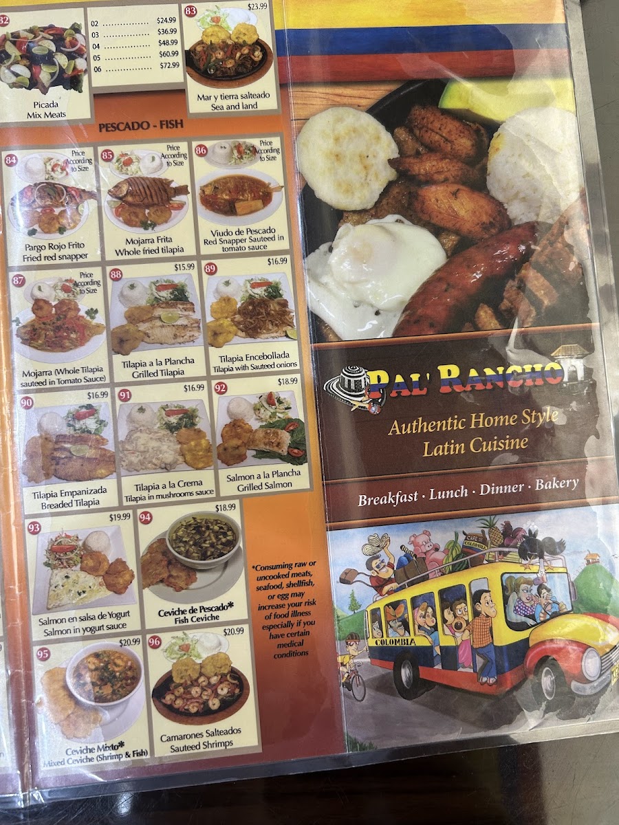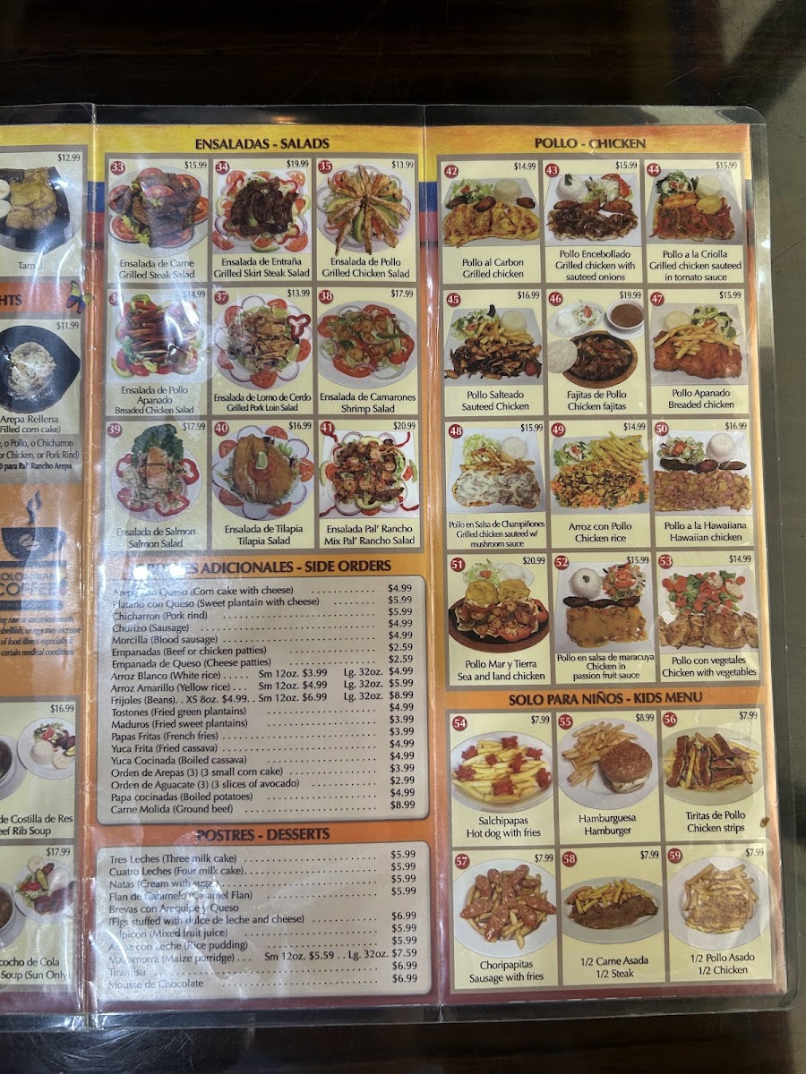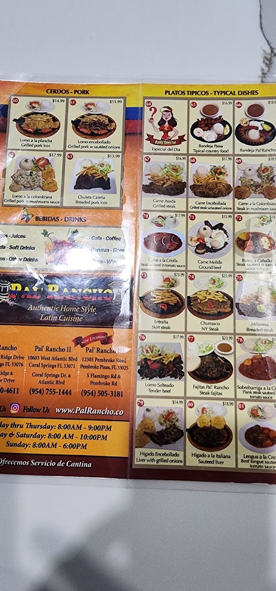 Una deliciosa hamburguesa colombiana hecha a nuestra manera con pollo asado o empanizado, o res, cubierto con chips de papa, lechuga, tomates, cebollas, tocino, queso y nuestras tres salsas caseras: rosada, de piña y cilantro. (Añade un extra de doble carne de pollo y bistec para una hamburguesa Pal Rancho). / A delicious Colombian style hamburger made our own way with grilled or breaded chicken, or beef, topped with little potato chips, lettuce, tomatoes, onions, bacon, cheese and our three homemade sauces: pink, pineapple, and cilantro. French fries are served on the side. (Add extra for the Pal Rancho burger which is double the meat chicken and steak).