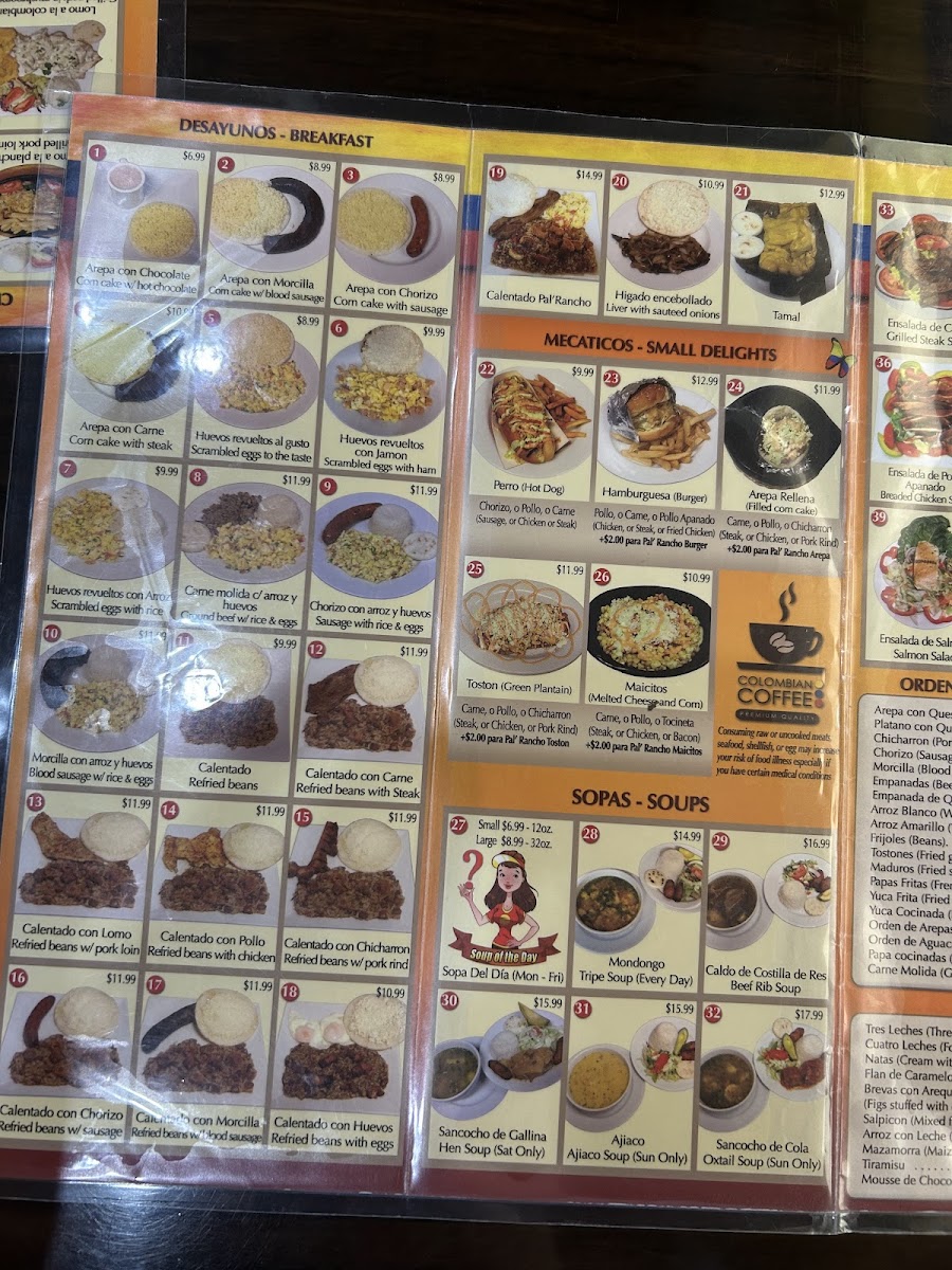 Sopa de mondongo tradicional hecha con papas, yuca, cerdo y res. Complementada con arroz blanco, ensalada, plátanos maduros, aguacate y arepa pequeña. Todos los días. / A traditional tripe soup made with potatoes, cassava, pork and beef. Complemented with white rice, salad, sweet plantains, avocado, and small arepa. Every day.