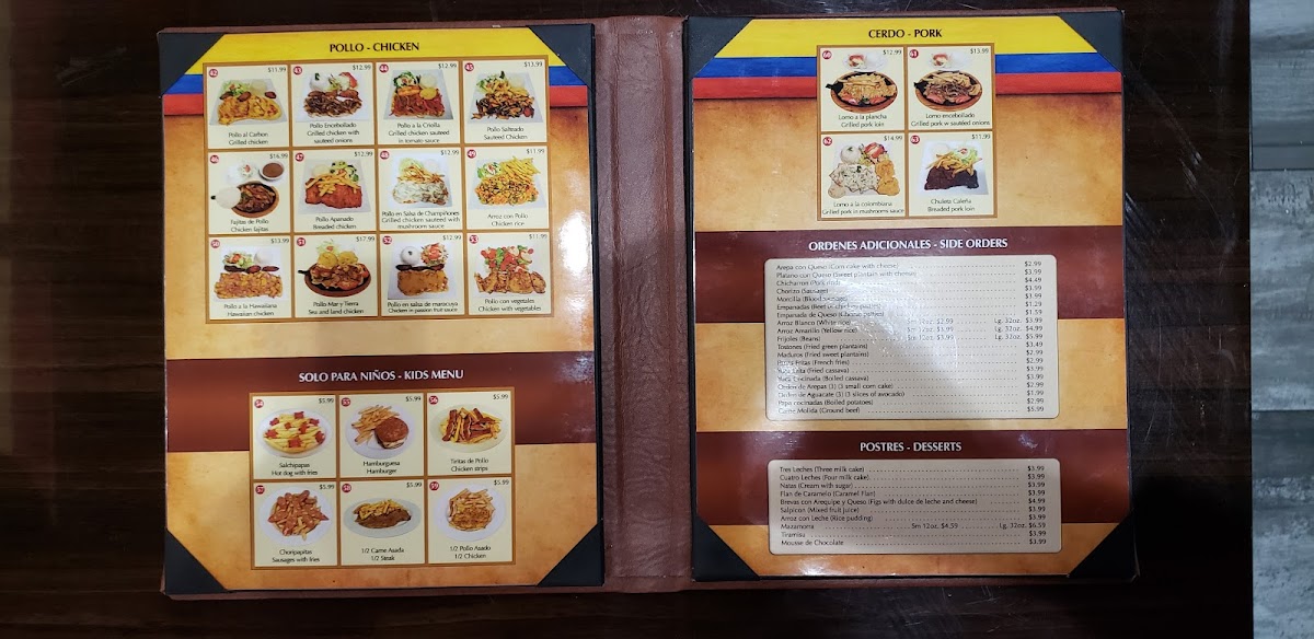 Torta de maíz rellena con costillas de cerdo, pollo, zanahorias, habichuelas, papas y pequeños trozos de chicharrón, todo envuelto en una hoja de plátano. Servidos con tu elección de arroz blanco o arepa pequeña. / A corn cake filled with pork ribs, chicken, carrots, peas, potatoes, and small pieces of pork rind, all wrapped in a banana leaf. Served with your choice of white rice or small arepas.